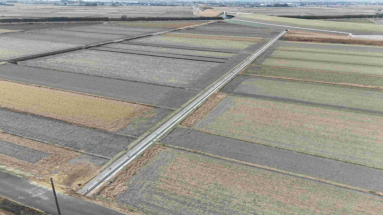 潮1函渠で行う水路接続工事のために、通行止めとなるので予告看板を設置しました。