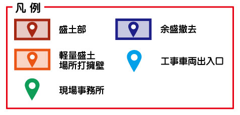 | 作業時間 | 8:00 ~ 17:00 まで (祝日は作業を行います。原則として土・日曜日は休工します。) ※作業の進捗、天候等により変更する場合がございます。 |