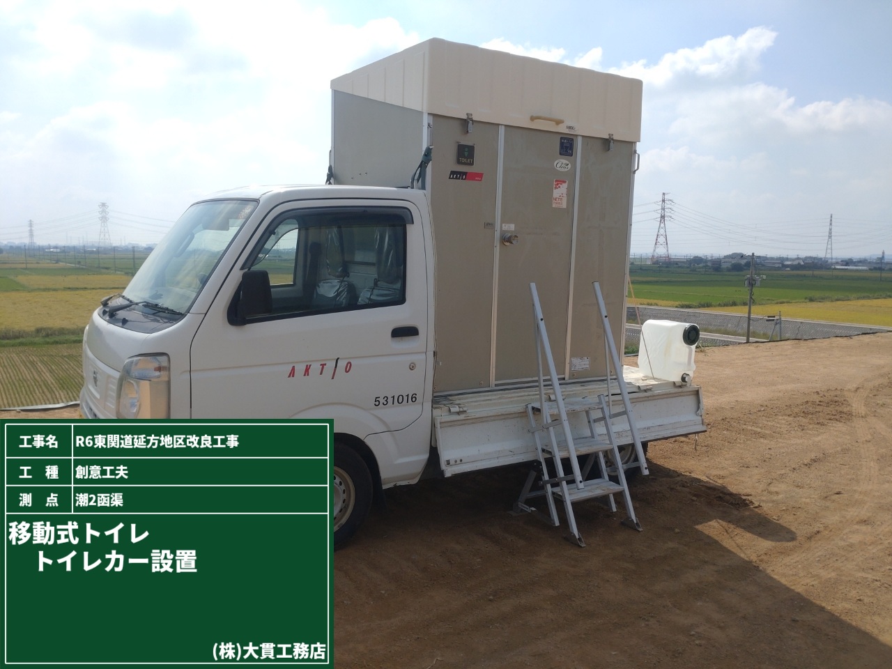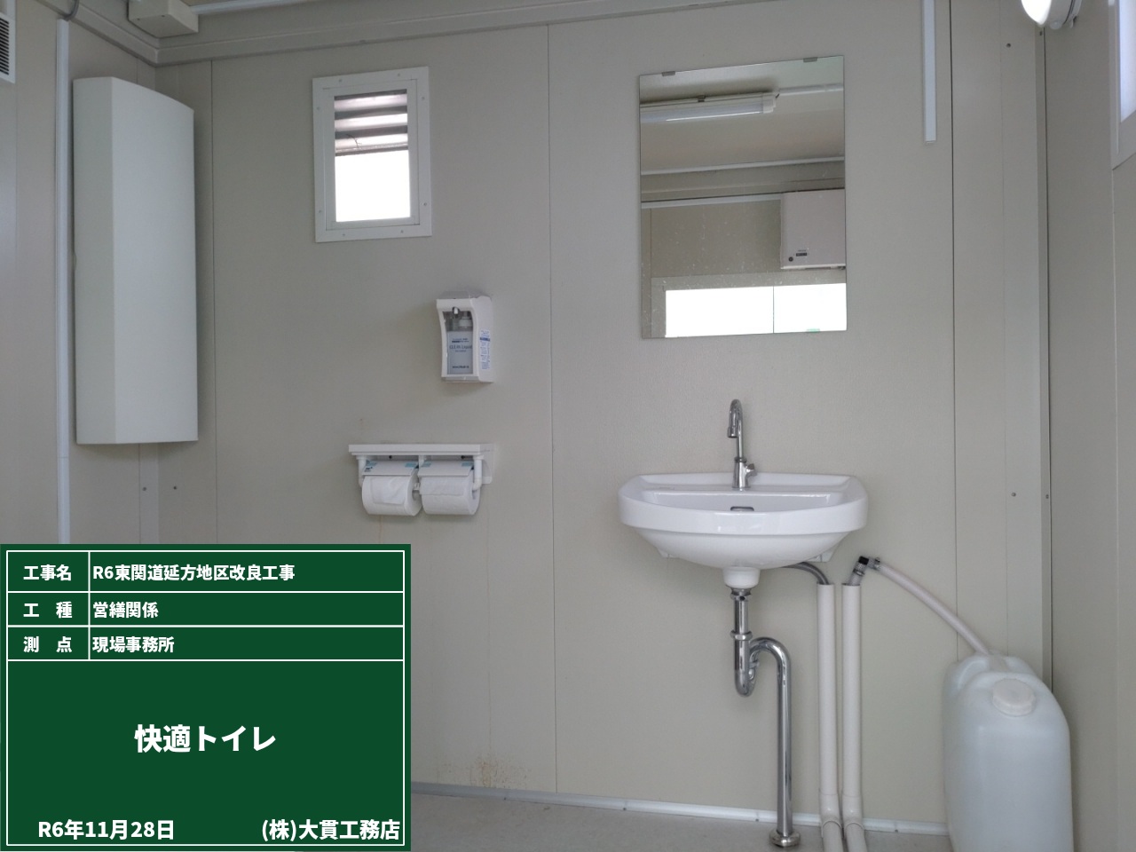 1枚目の写真、手前の緑色が現場事務所で、事務所の奥にある白いのが快適トイレです。