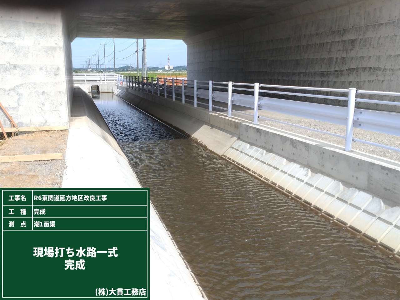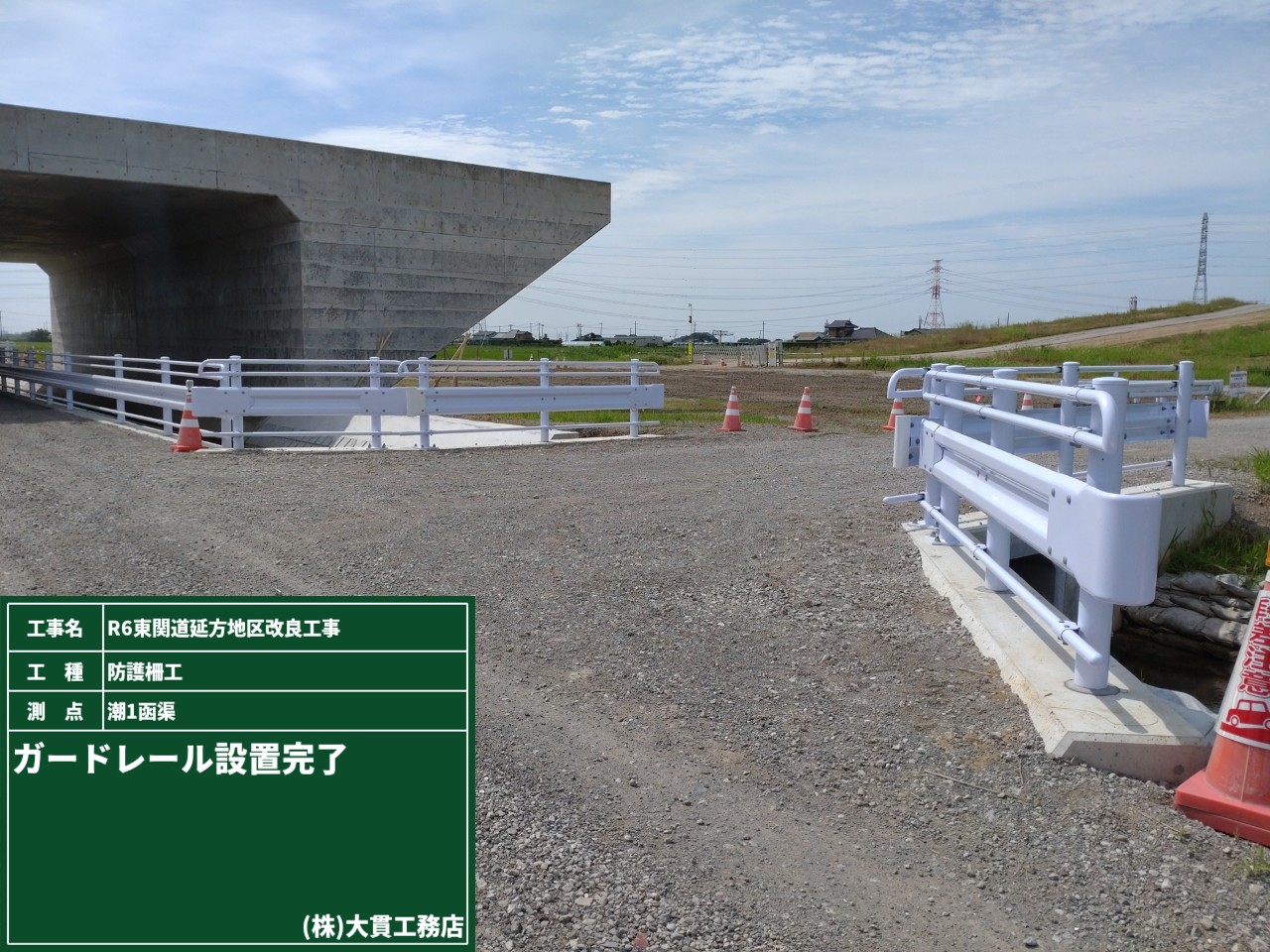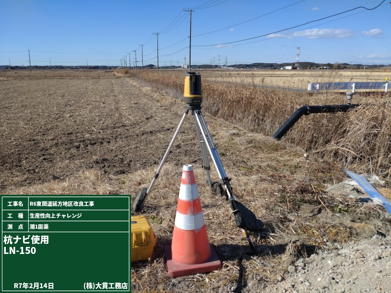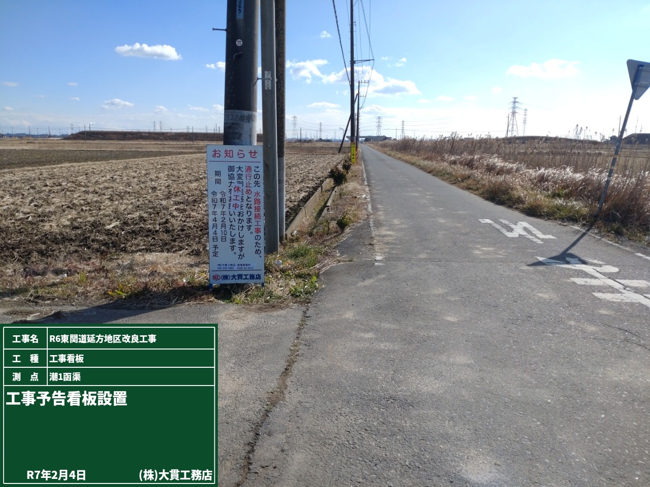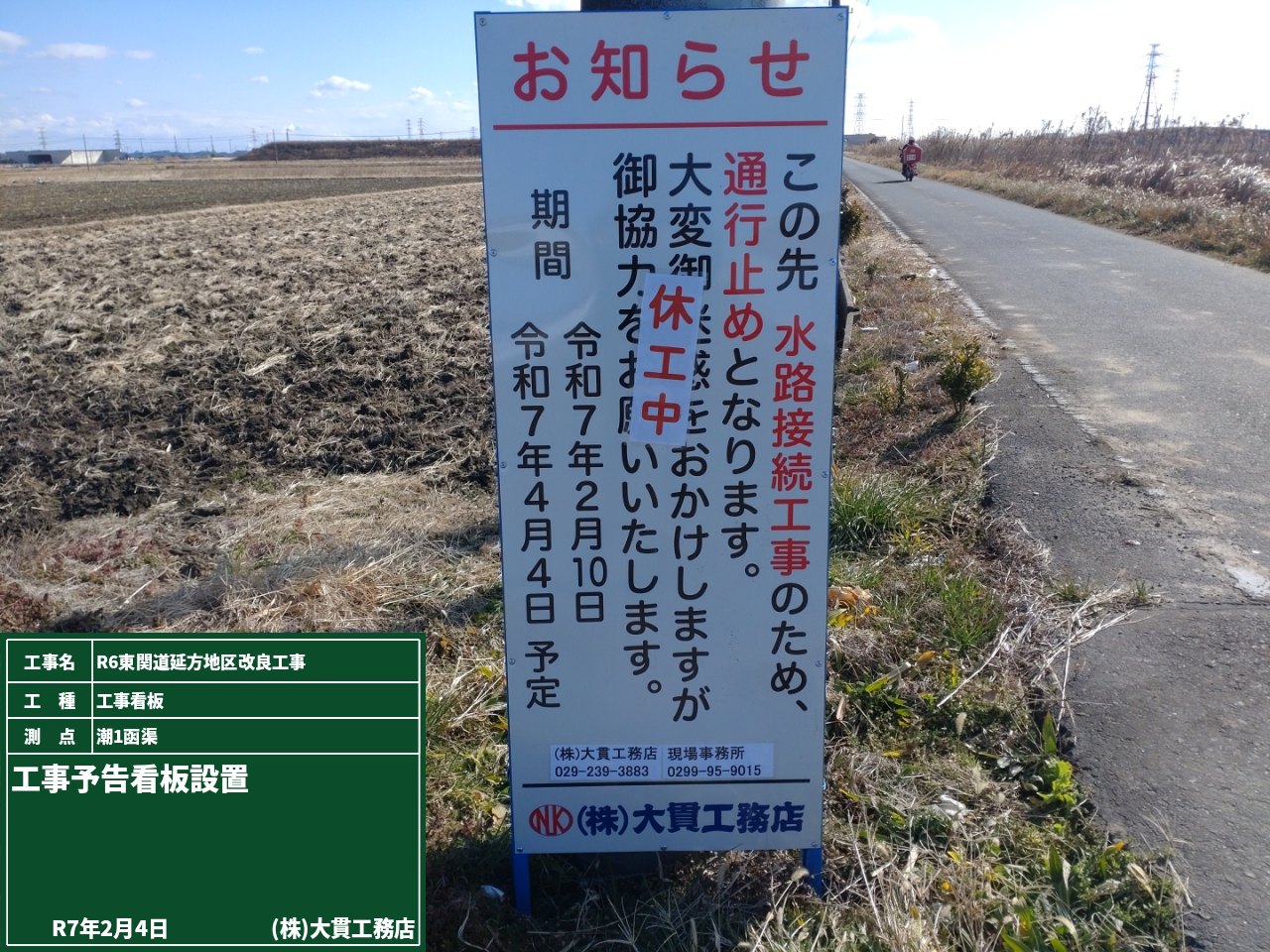 潮1函渠で行う水路接続工事のために、通行止めとなるので予告看板を設置しました。