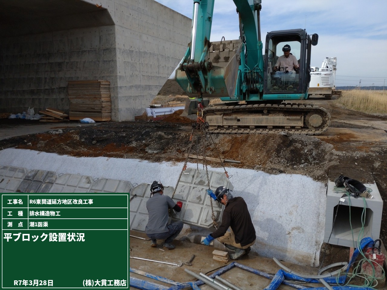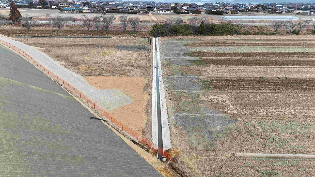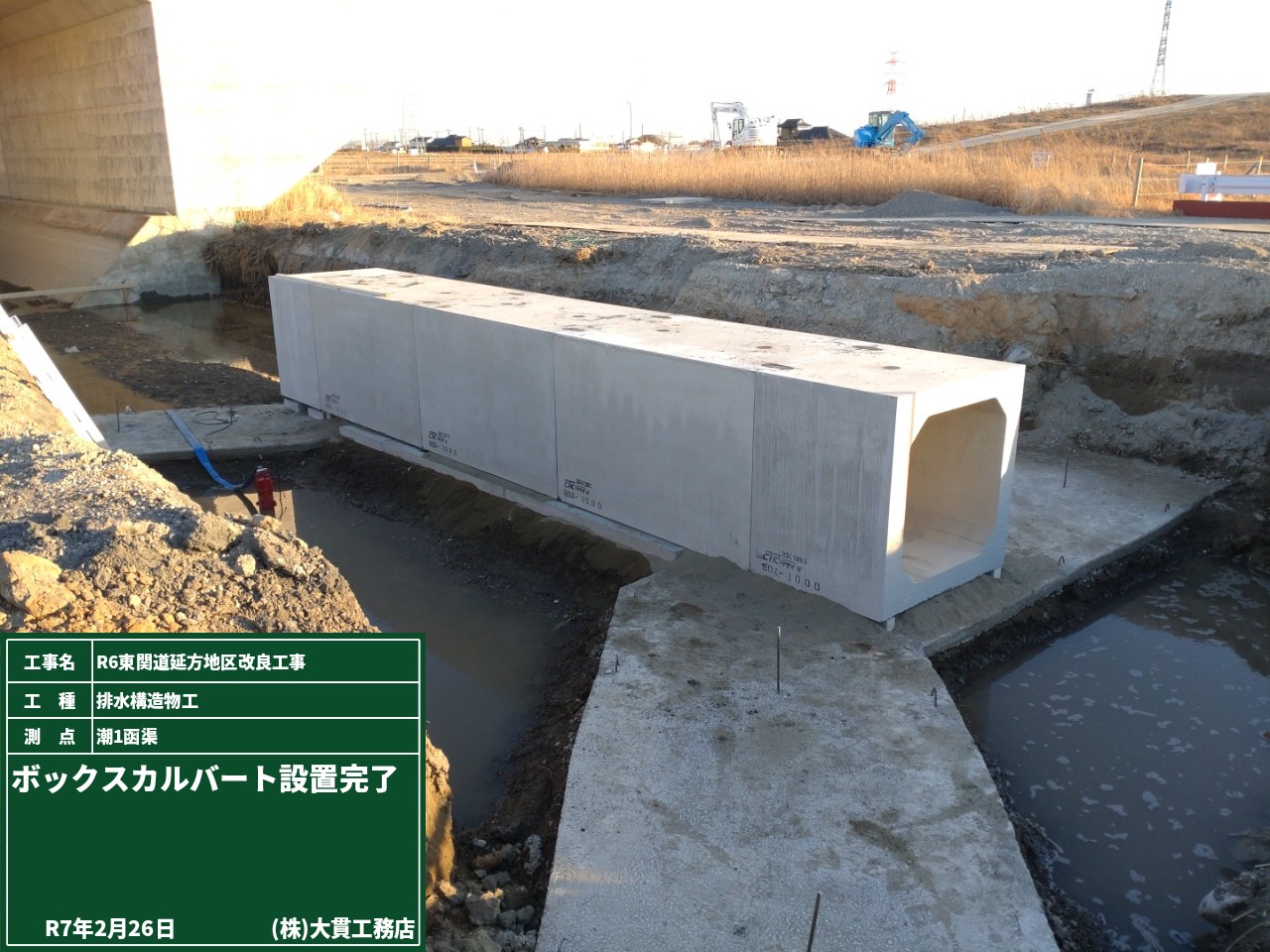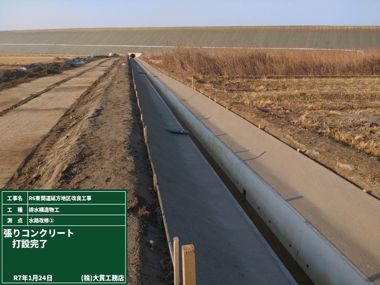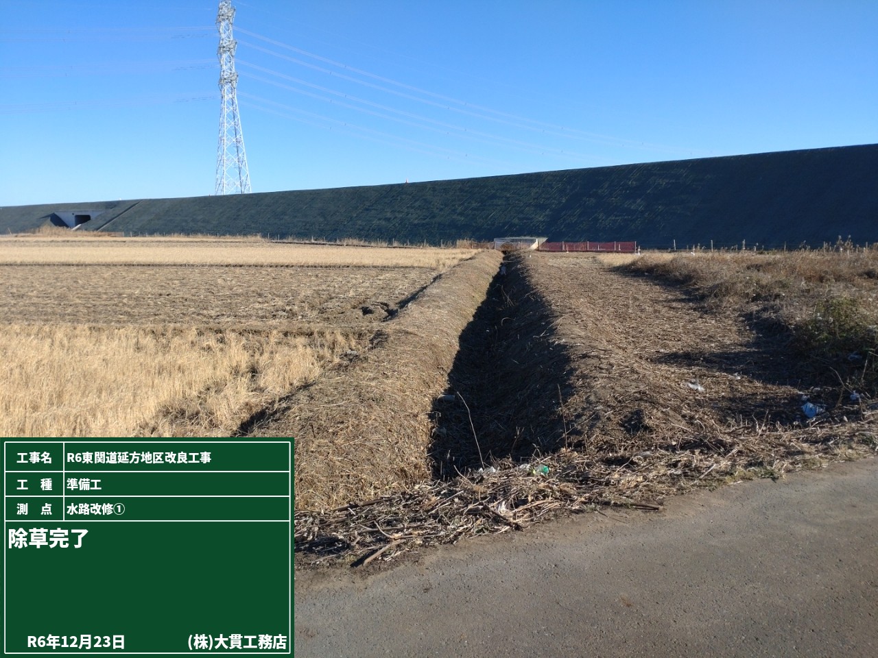 潮1函渠で行う水路接続工事のために、通行止めとなるので予告看板を設置しました。