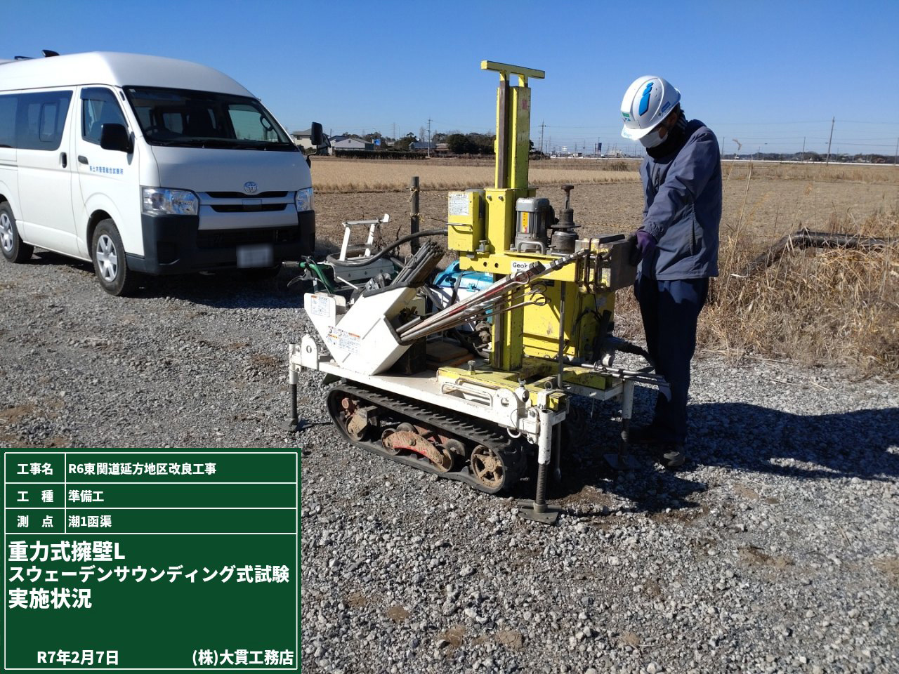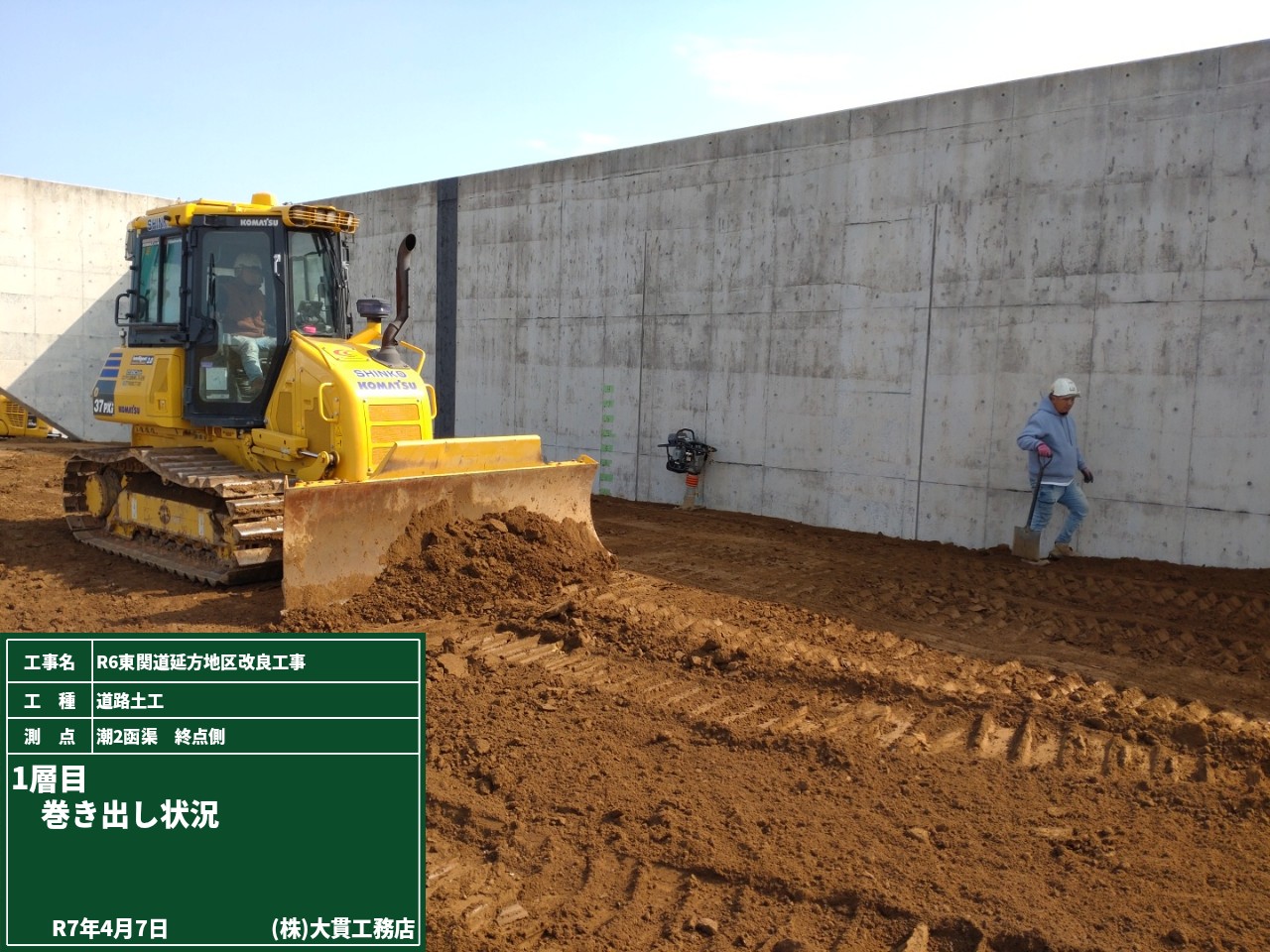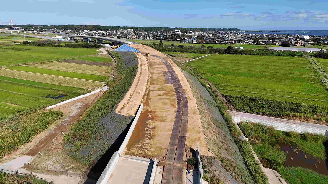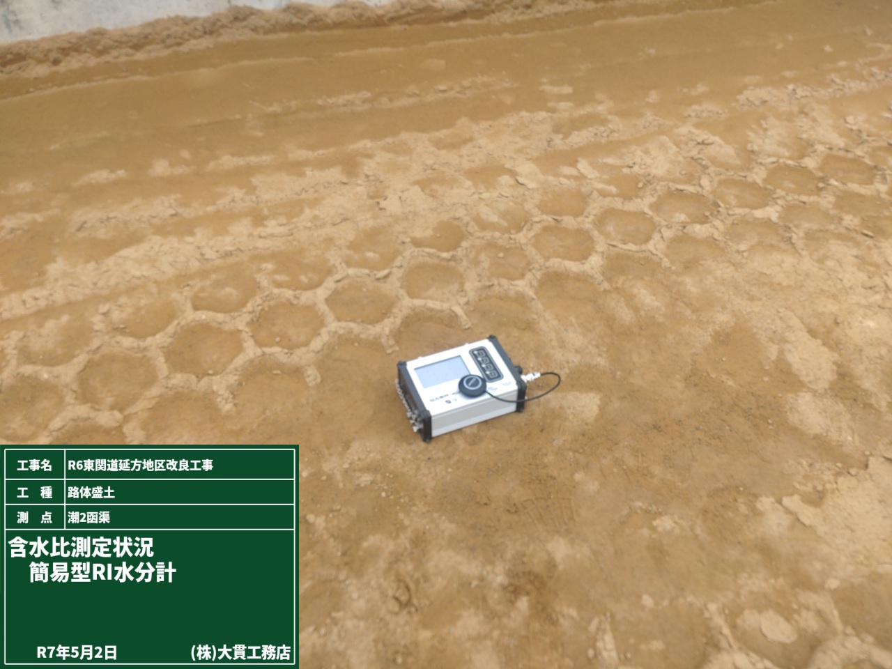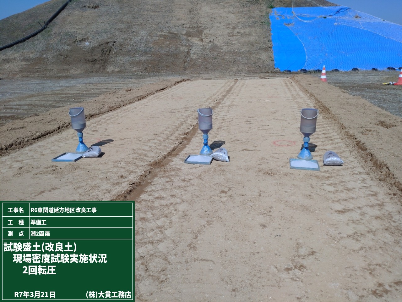 品質の良い盛土工事をするためには欠かせない試験盛土。発注者立会のもと、試験を進めています。