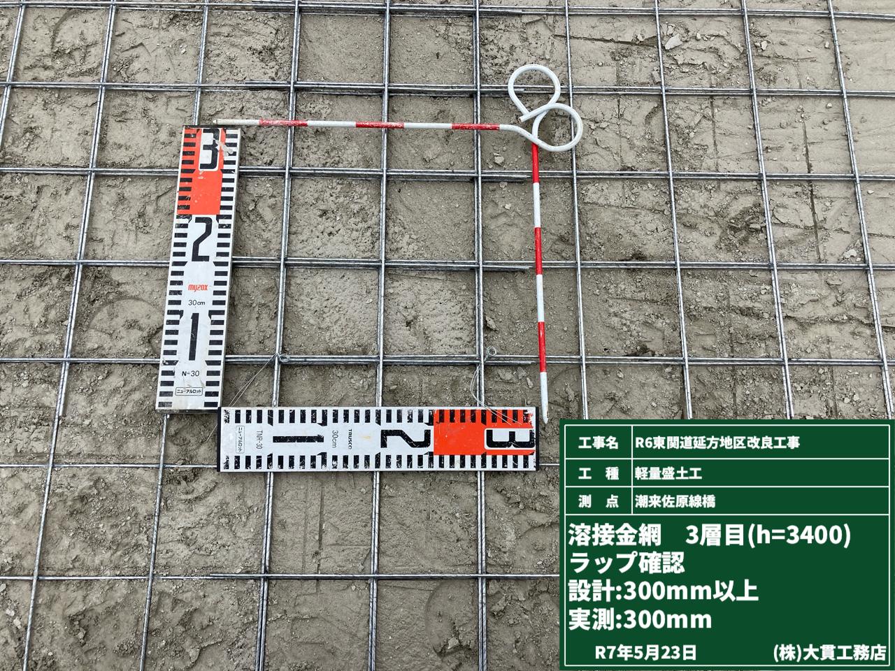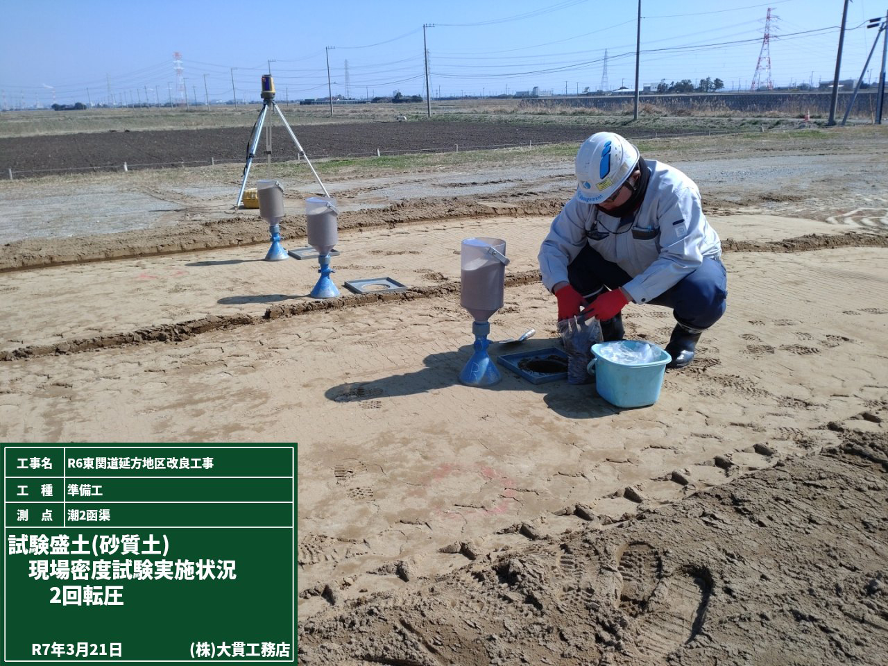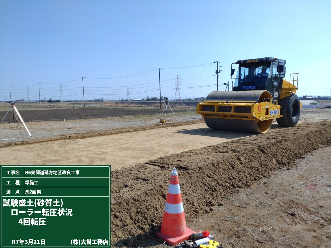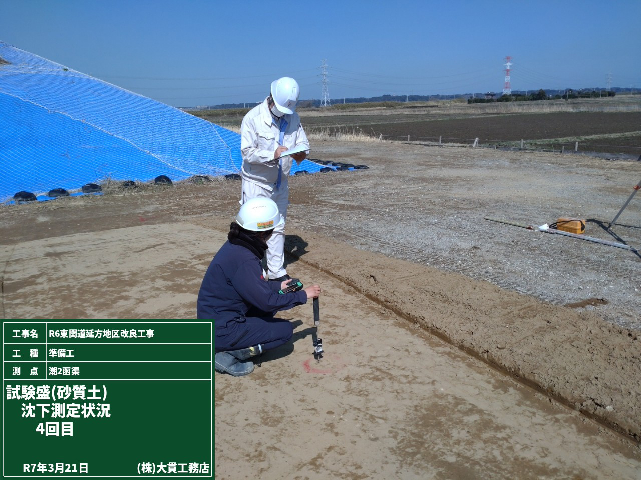 右2枚目の写真は盛土材を敷き均した後と締固め機械で転圧した後で、盛土が「どれだけ沈下しているか」を確認しているところです。