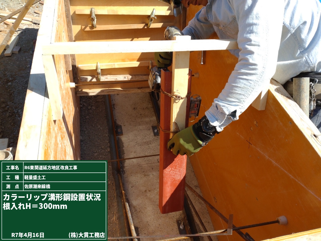 軽量盛土のパネルを止めるための支柱として、リップ溝形鋼を埋め込みます。