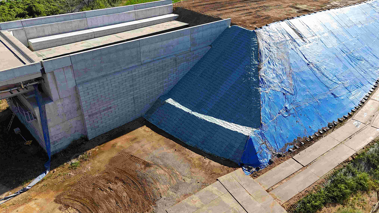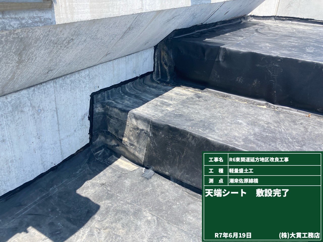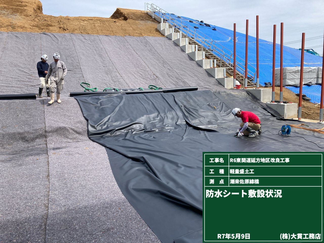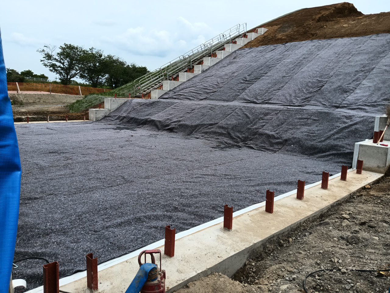 そして天端には、水の侵入を防ぐための遮水シートを敷設しています。
