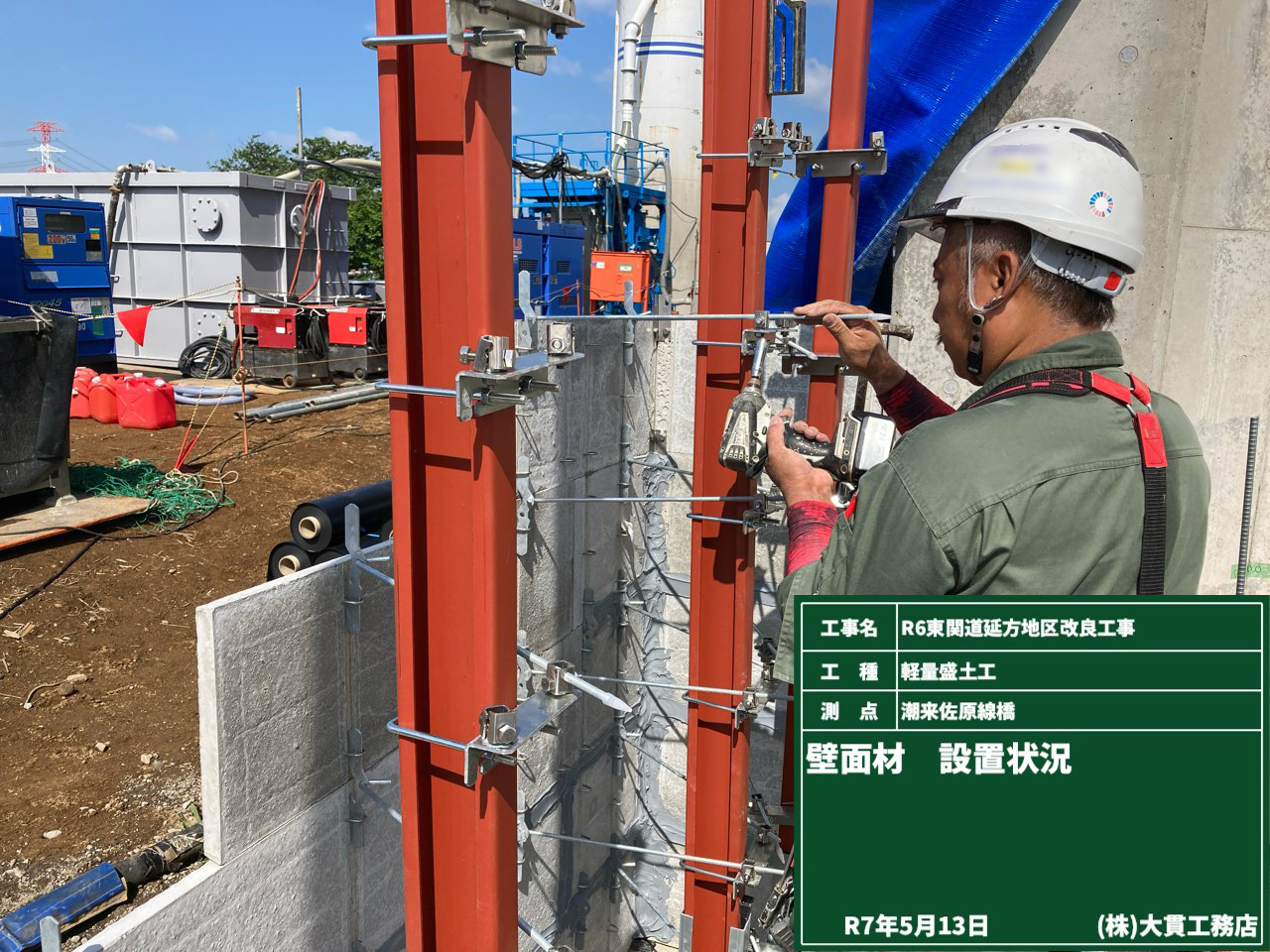 盛土内に鋼材を入れて土を補強して、垂直盛土をつくっていきます。
