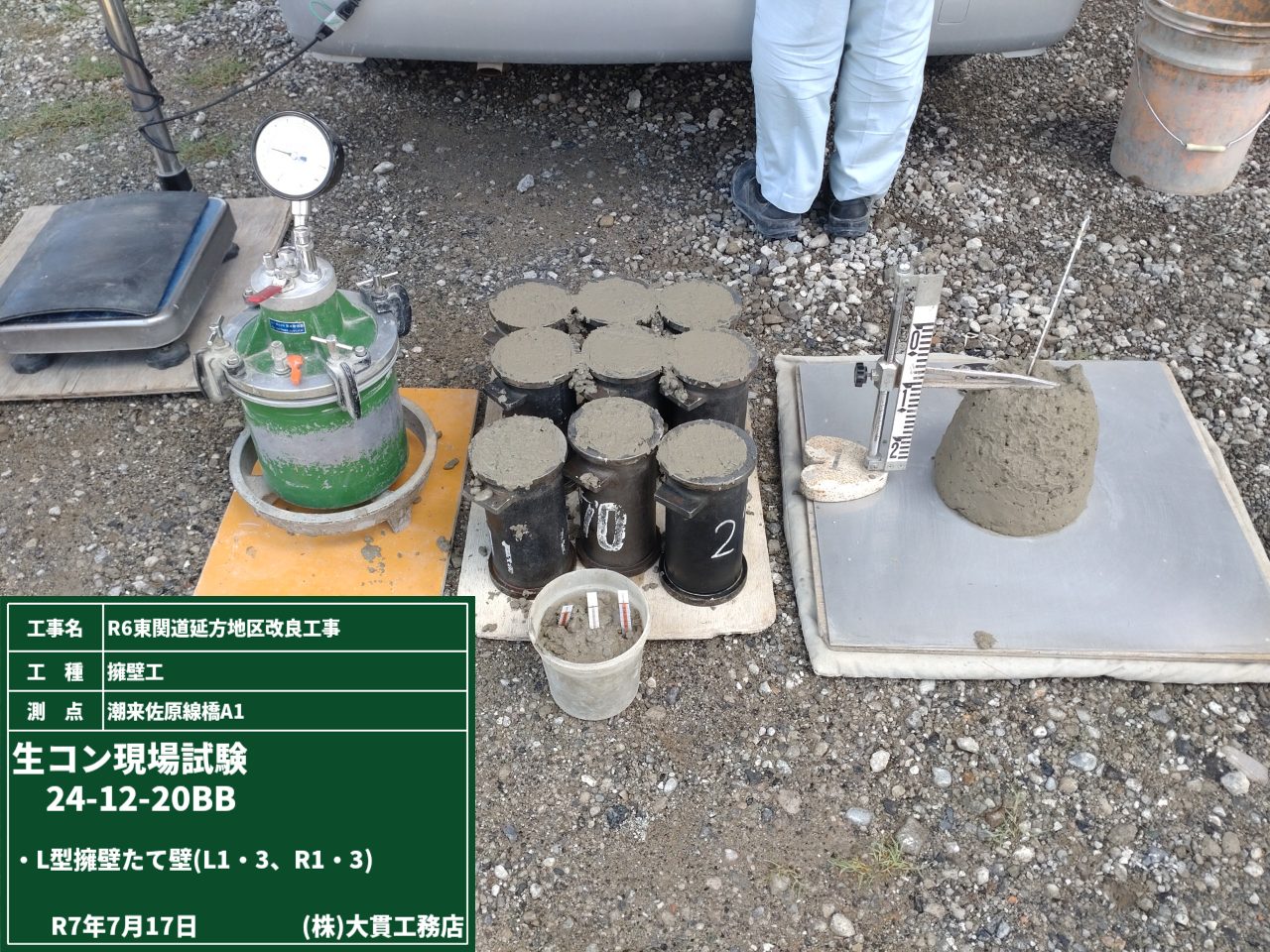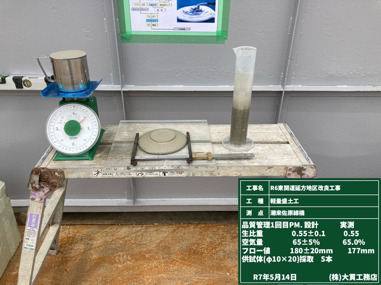 エアミルクの打設前には供試体を採取して品質を確認します。