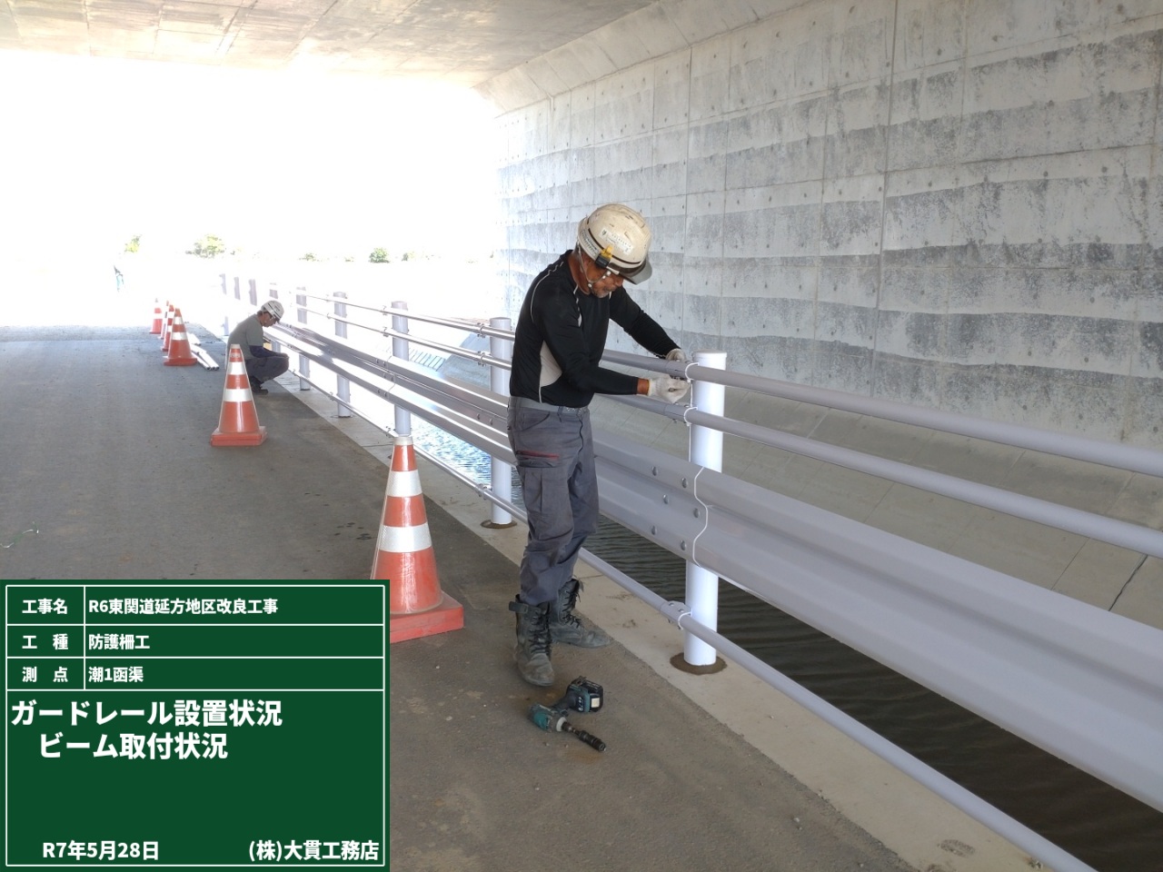 完成した水路の天端に、ガードレールを設置していきます。