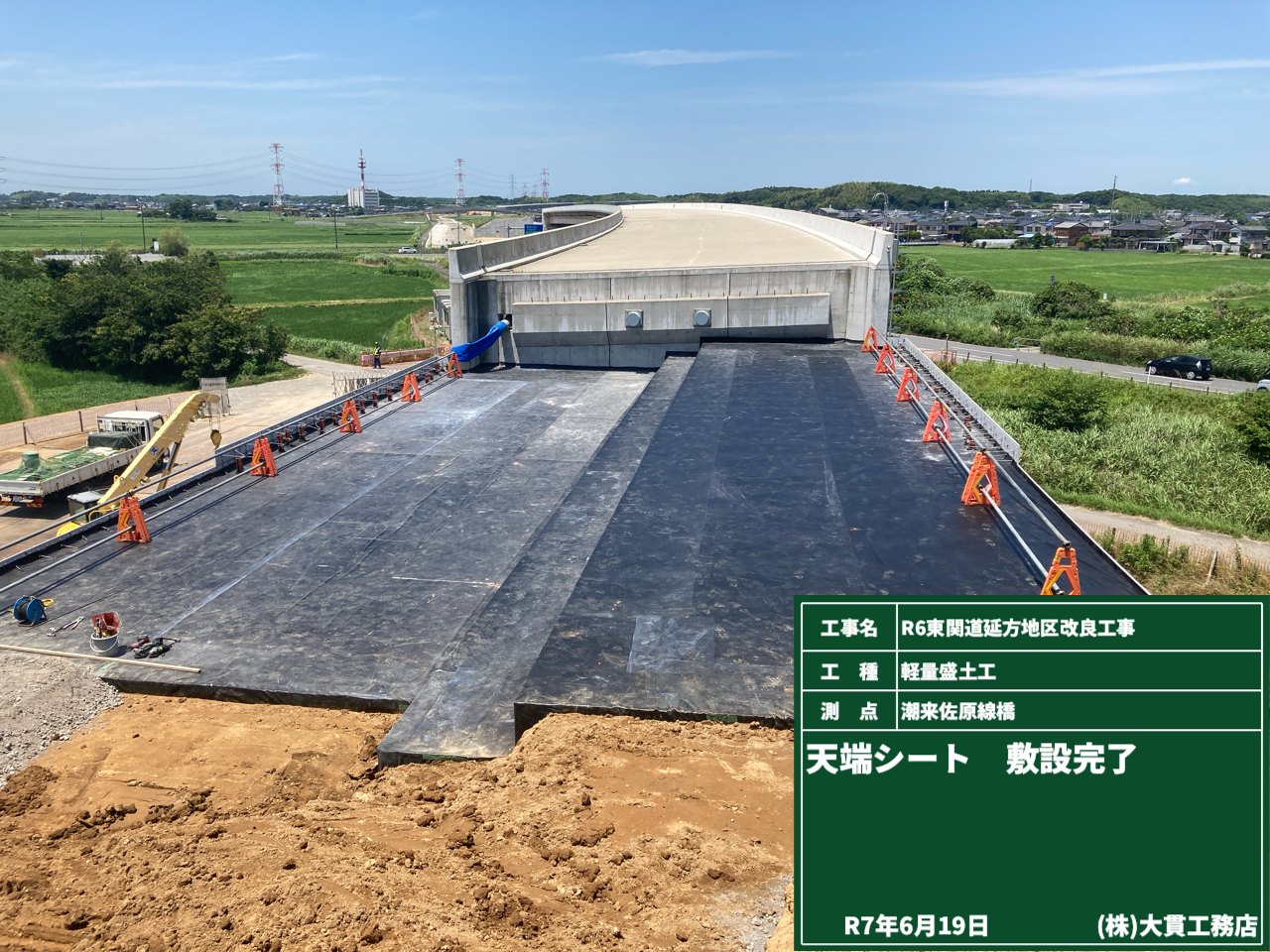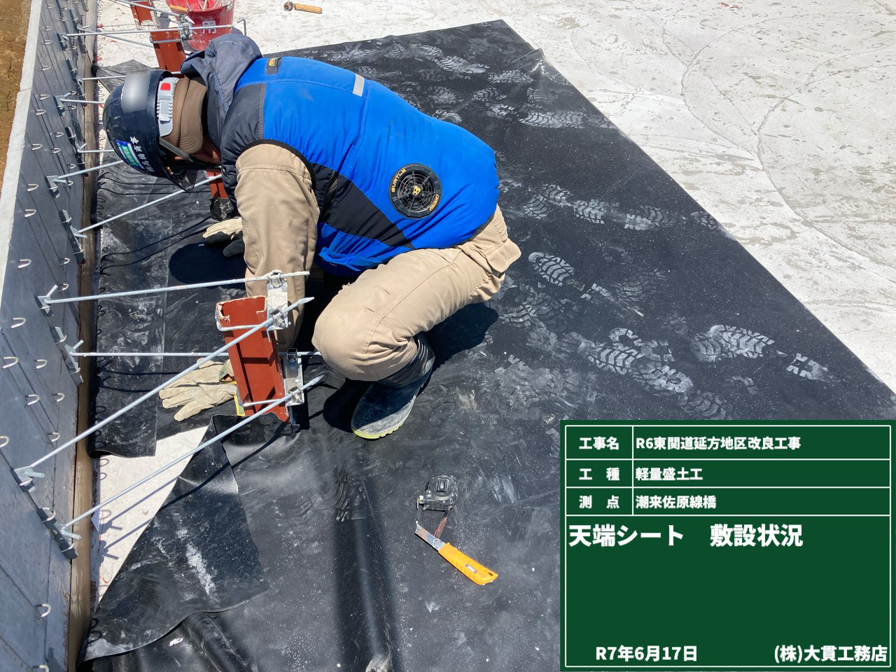 天気の良さ(良すぎる位の天気)にも助けられ、シートの敷設が完了しました。