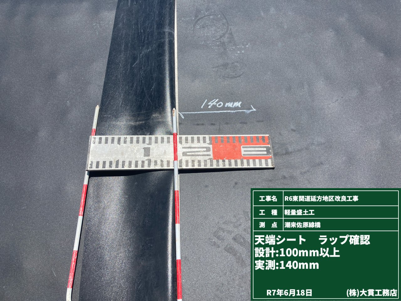 シート同士は繋目からの水などの侵入を防ぐため、今回は140㎜の幅で重ね合わせていきます。