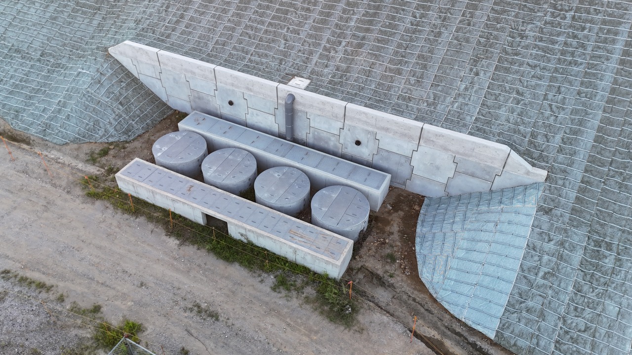 1号調整池油水分離桝部 補強土壁及び分岐桝完成